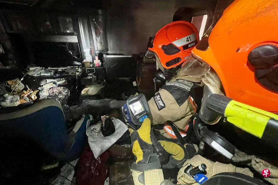 裕廊和碧山消防局的消防员随后赶到现场,发现单位客厅失火。一队消防员在尝试扑灭客厅的火势时,另一队消防员则使用电锯隔开卧房铁窗花,将受困的居民救出。