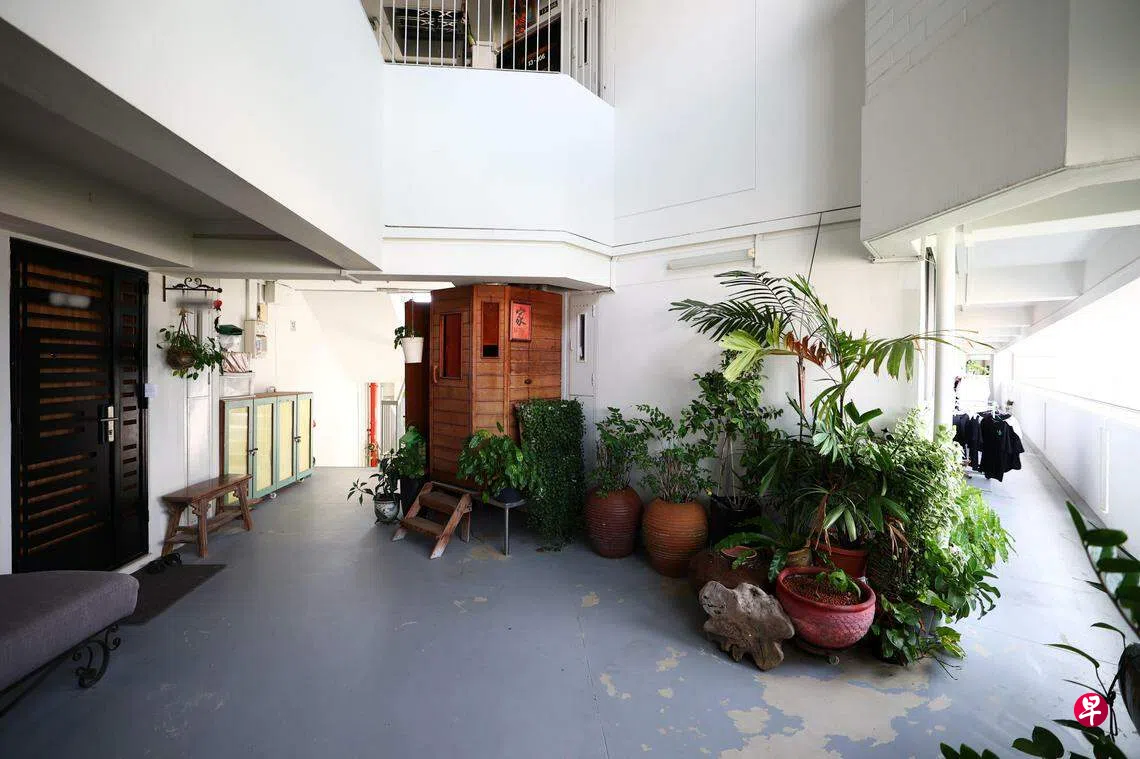 《联合早报》记者星期三(7月10日)到实龙岗中路第427座组屋采访时,发现单位外的走廊上装置了桑拿房,附近的走廊也摆放超过30个盆栽。