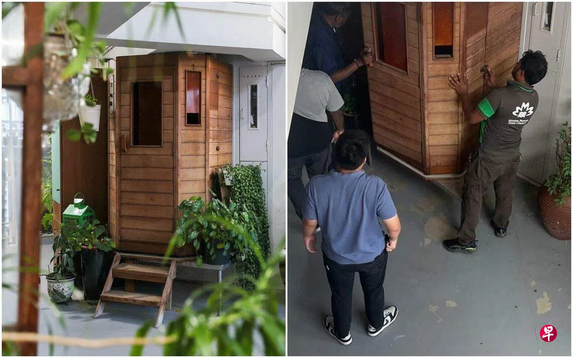 实龙岗组屋走廊上的桑拿房,经媒体星期三(7月10日)报道后,星期四(11日)下午2时左右由市镇会派人拆除搬走。