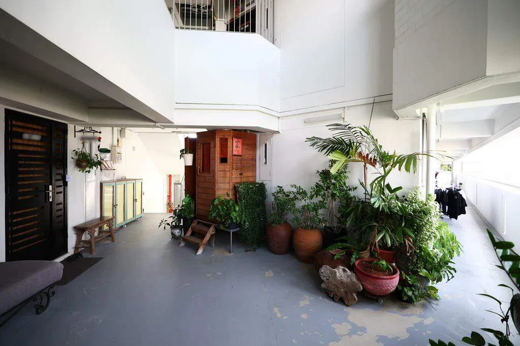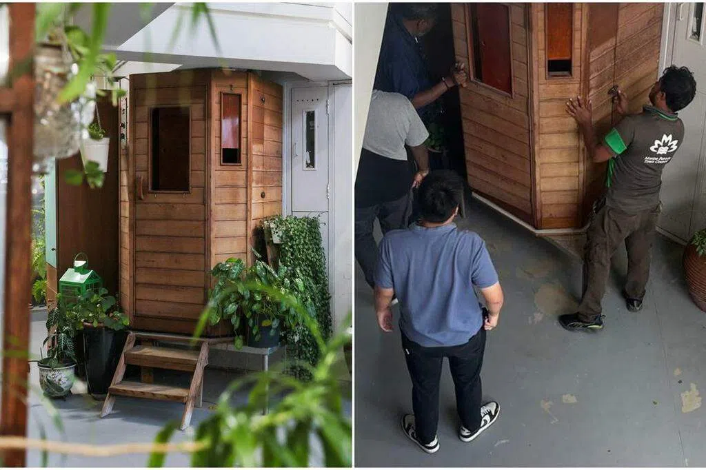 《联合早报》上个星期三(7月10日)报道,实龙岗中路第427座组屋的一户人家,在走廊靠墙处摆了一个没有衔接电源、被当成储藏室使用的桑拿房,周边还种了一盆盆植物。