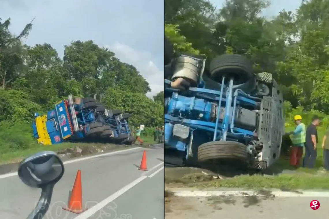 据社交媒体流传的画面,一辆蓝色罗厘往左侧翻,倒在路旁的草丛。由于双向各只有一条车道,所以车祸路段的车辆行驶缓慢,当局也摆放交通锥警示驾驶者。