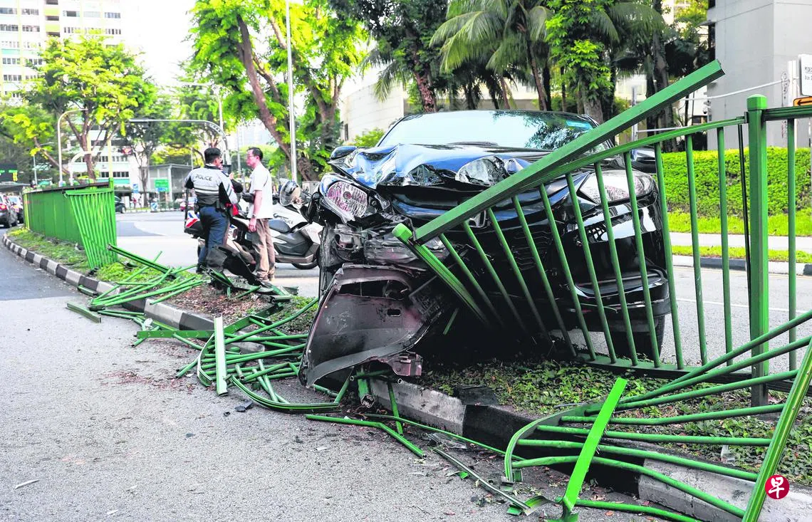 私召车在行驶途中突然失控并撞断路中央的栏杆,栏杆还击中另一车辆,55岁司机协助警方调查。