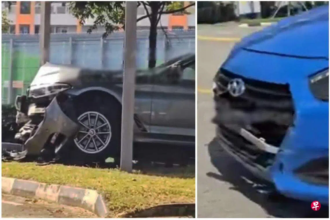 根据社交媒体流传的画面,一辆宝马汽车驶上分隔岛,防撞杆脱落,引擎盖凹陷,车头部分明显受损。一对男女在附近,女子正拨电话求助;另一段画面则显示一辆康福德高德士车头受损,停在道路中央。