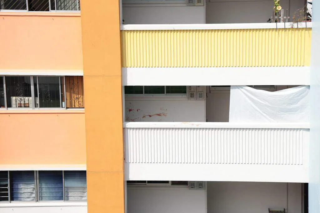 案发后,单位外走廊一片狼藉,隔壁单位窗口下的墙壁和组屋围墙留下斑斑血迹。有居民说,事发前就听到两名男子的争吵声,吵架声在后来停止,没想到会发生命案。