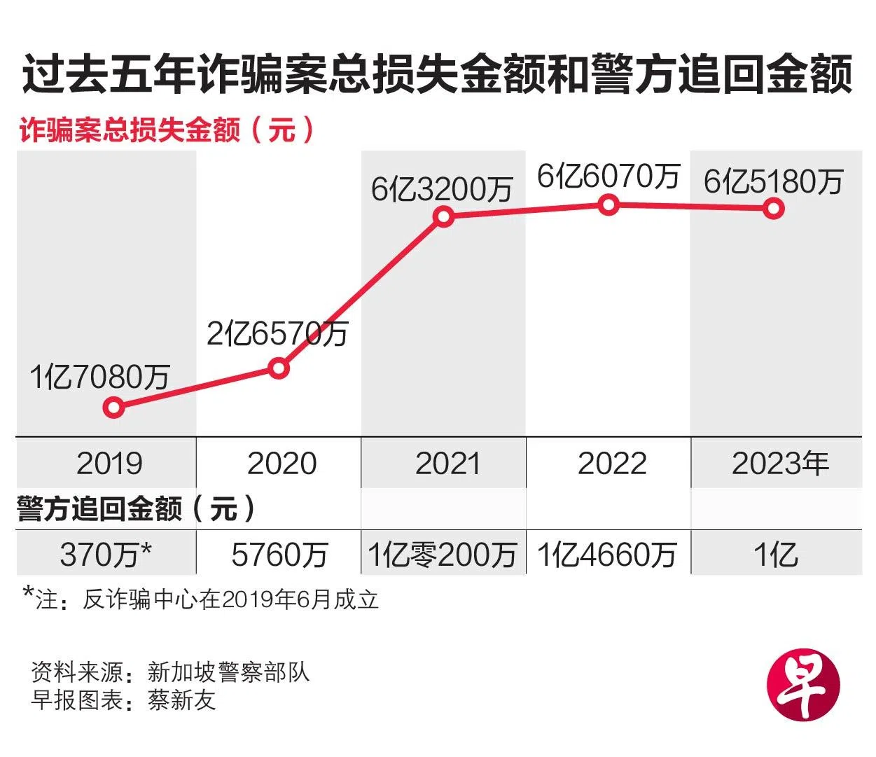 根据警方提供给《联合早报》的数据,反诈骗中心2019年成立后的约半年里,共追回370万元的诈骗损失款项,而随着诈骗案总损失金额激增,追回的金额过后也逐年不断攀升。