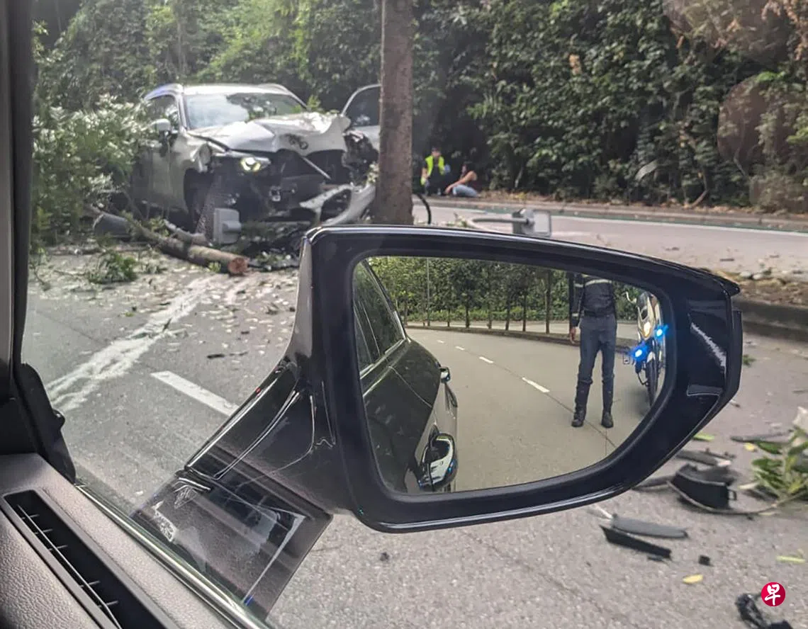 公众马先生(52岁)通知《新明日报》,他当天早上经过时看到一辆灰色宝马撞上路中央的一棵树,救护车已到场救援。