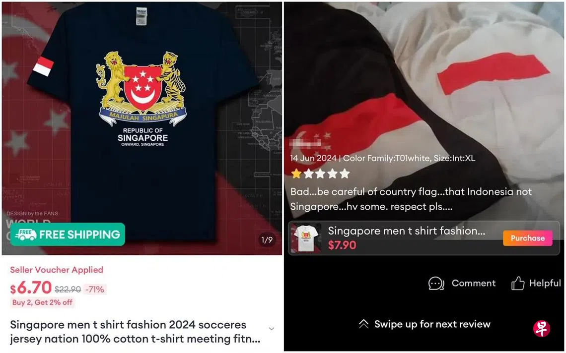 但有顾客反映,袖子上的新加坡国旗,被错误印成了印度尼西亚的国旗。新印两国的国旗十分相似,差别在于新加坡国旗的左上角,有白色的一弯新月和五颗小五角星。