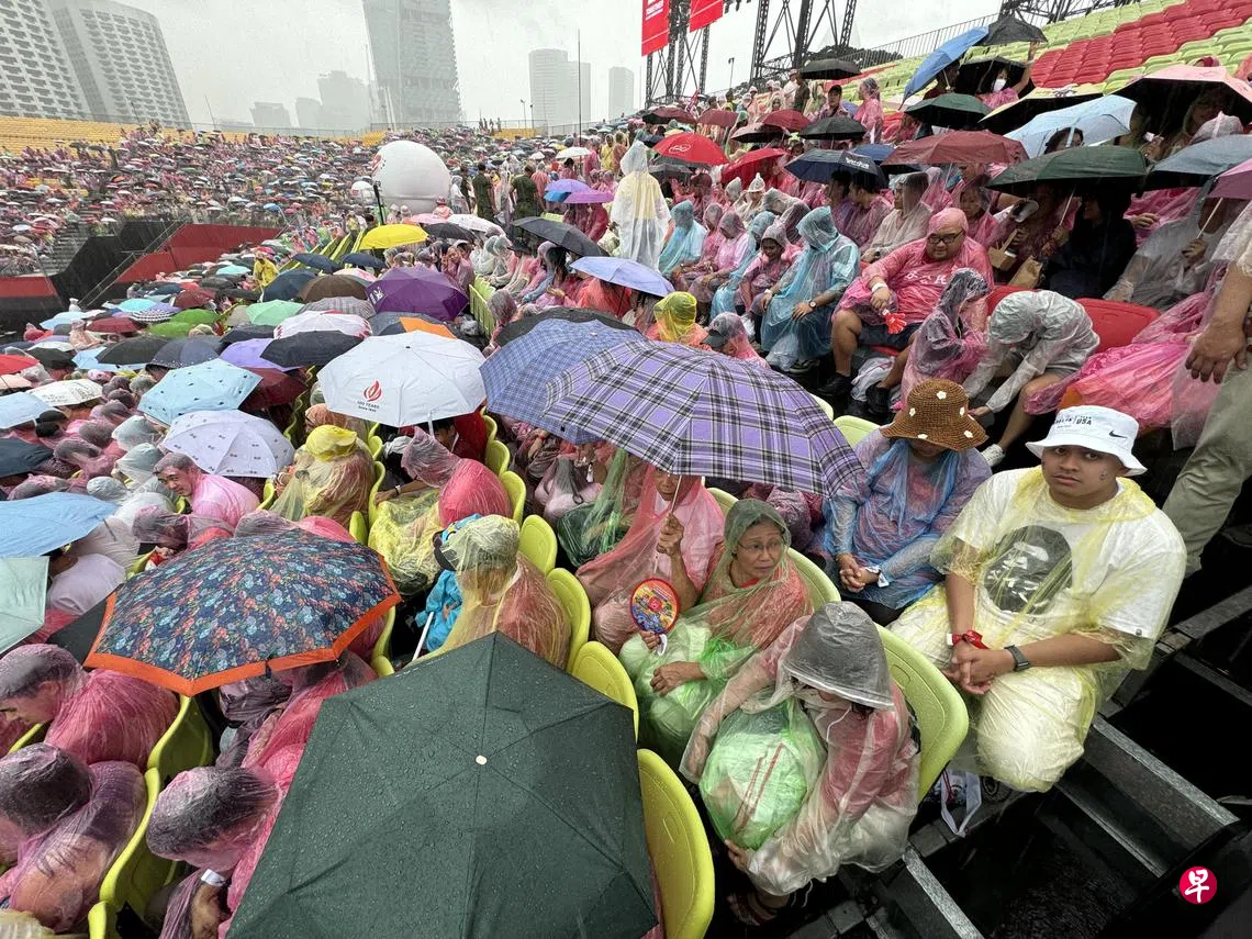 距离我国独立59周年国庆庆典开场不到一小时,现场突降暴雨,但民众热情不减,仍在雨中入场,并在会场耐心等候。