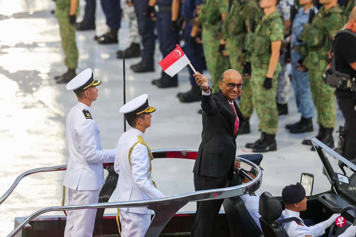雨过天晴,2024年国庆庆典按计划举行,尚达曼总统和黄循财总理抵达政府大厦前大草场。这是两人上任后,首次出席国庆庆典。