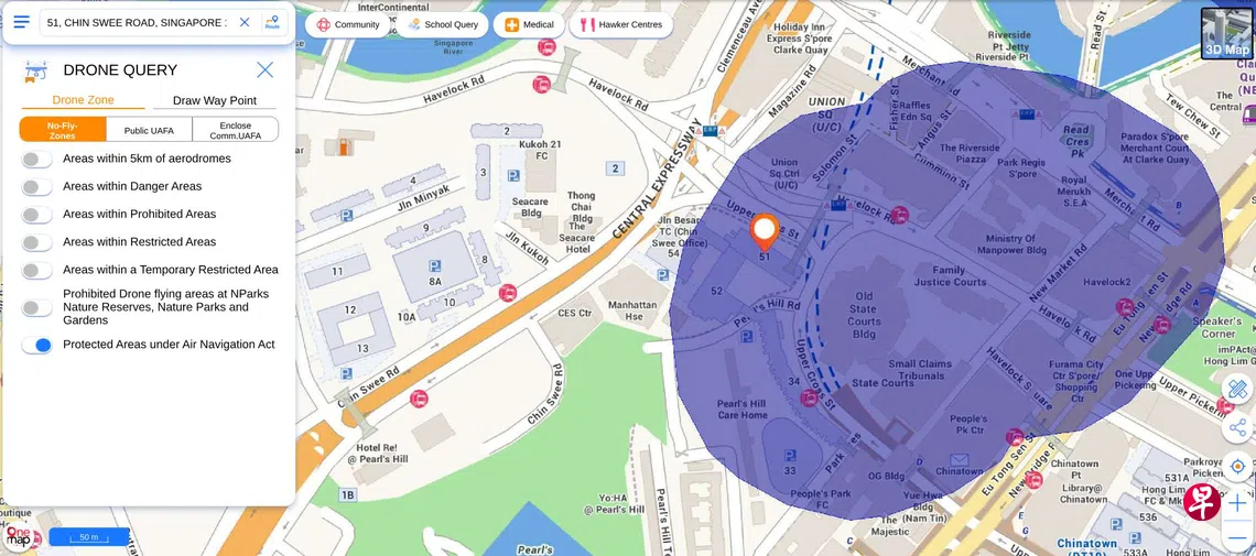公众可通过新加坡土地管理局多功能地图OneMap的网站或应用,查询禁止操作无人机的范围。