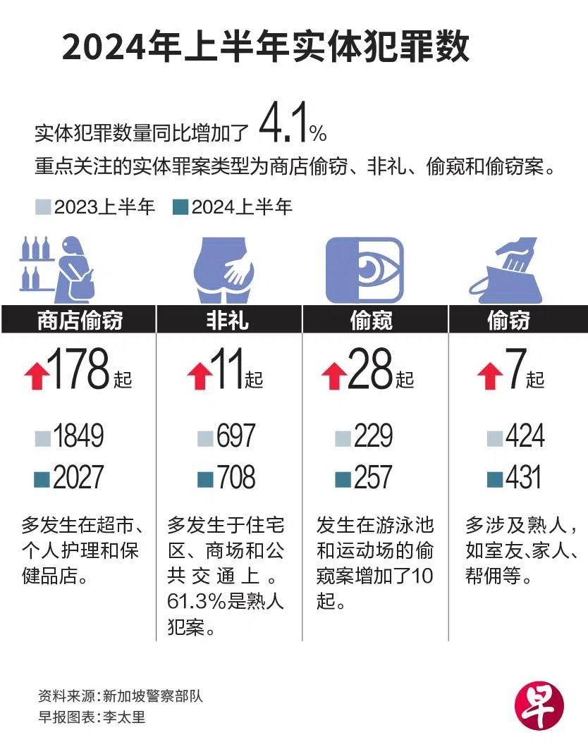 2024年上半年发生2027起商店偷窃案,比去年的1849起增加178起。占所有实体罪案的20.1%。商店偷窃案也是19岁以下青少年犯下的主要罪行之一。