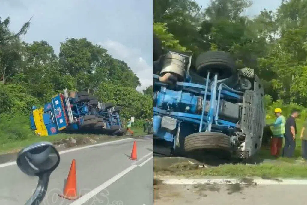 这起事故发生在星期六(8月31日)上午10时50分,一辆自卸卡车在玛丽蒙路前往汤申路方向打滑侧翻。
