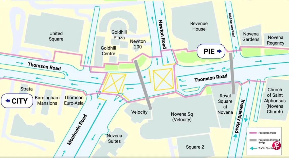 配合南北交通廊道施工,诺维娜广场(Velocity@Novena Square)前连接汤申路、纽顿路和摩绵路的十字路口,将从星期天(9月8日)起改成为两个T字路口。