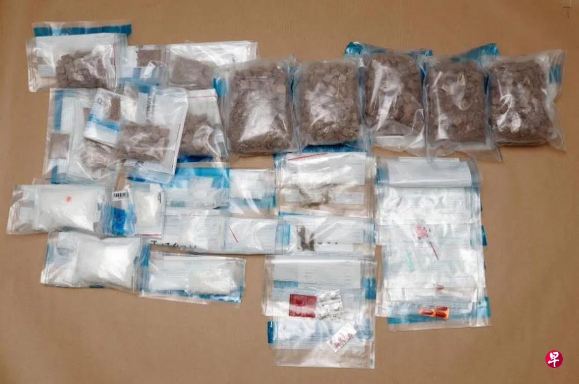 肃毒员在住宅内共查获2.8公斤海洛英、385克“冰毒”、51克“爱他死”、24克大麻、九克氯胺酮以及13片艾利敏5号药丸。