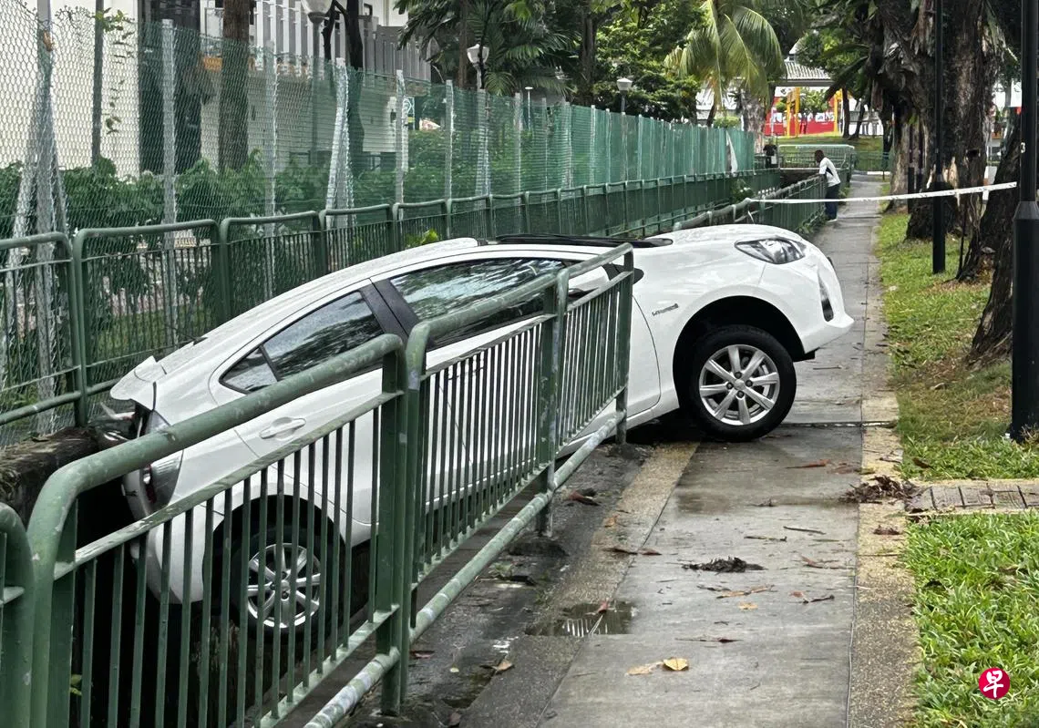 车子在雨天倒车时失控撞毁栏杆,半个车身冲入水沟,女驾驶受困车内,民防人员下沟渠救人。