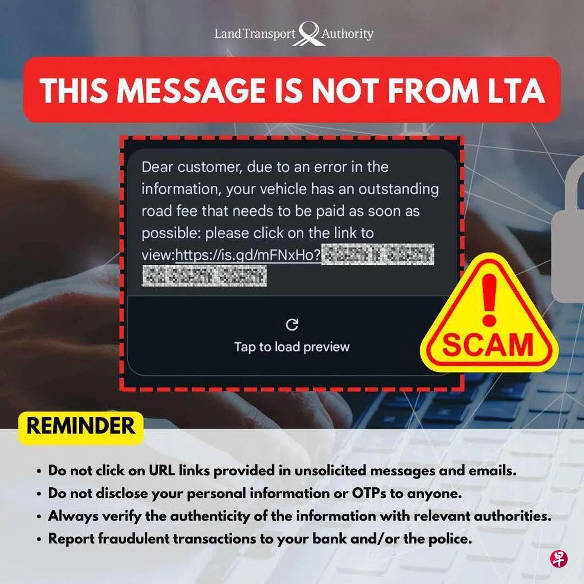 骗子声称车主欠下过路费,要求车主点击短信链接付款。陆路交通管理局提醒公众慎防这类骗案。