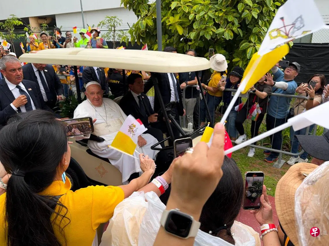 约千名天主教徒聚集樟宜机场侏罗纪步道欢迎教宗方济各,尽管现场下起阵阵细雨,信众热情不减,齐呼“教宗万岁”夹道欢迎。