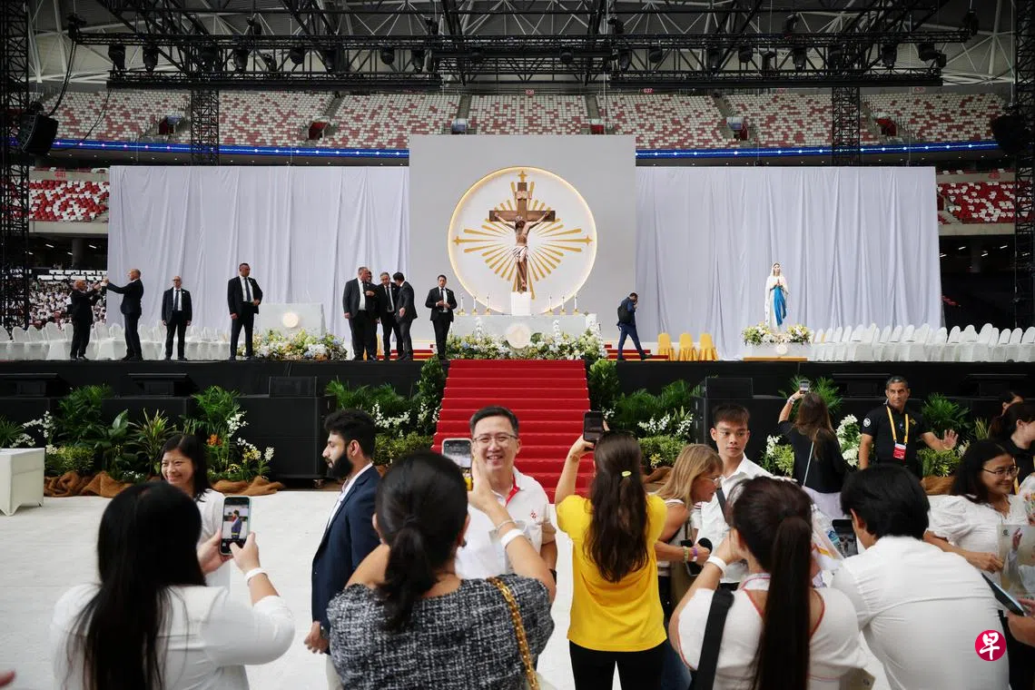 《联合早报》记者下午1时许抵达现场时,体育场地铁站和相邻的嘉龙威购物商场内已聚集大量信众,靠近体育场入口的检票处也有队伍形成,现场井然有序。
