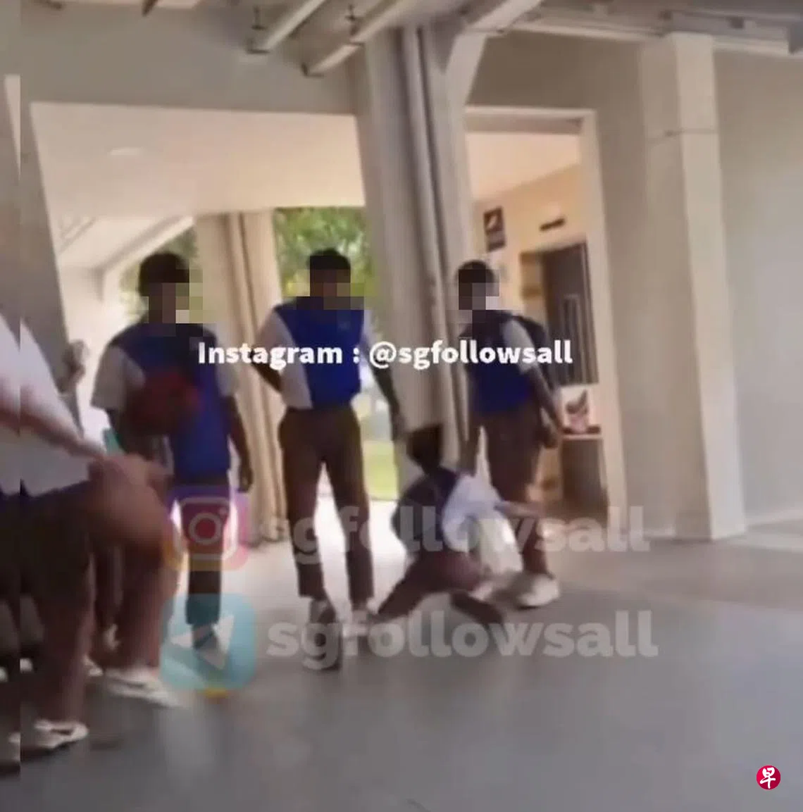 社交媒体自星期天(15日)起开始流传一则视频,视频中显示穿着百德中学体育服的六七名男生,在一座组屋楼下围堵一名身材瘦小的男生。后者看似在回答问题时,冷不防被站在背后、比他高出一个头的男生使劲一脚踹开。