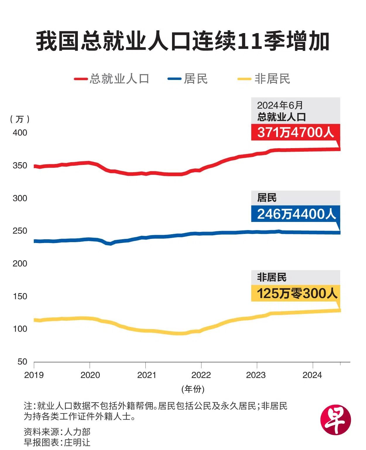 经济前景向好,以及劳动市场持续处于“工找人”的情况,让我国今年第二季的总就业人数,连续11个季度增加。不过,新增劳动力全为非居民,他们主要是来自建筑业和制造业的工作准证持有者。