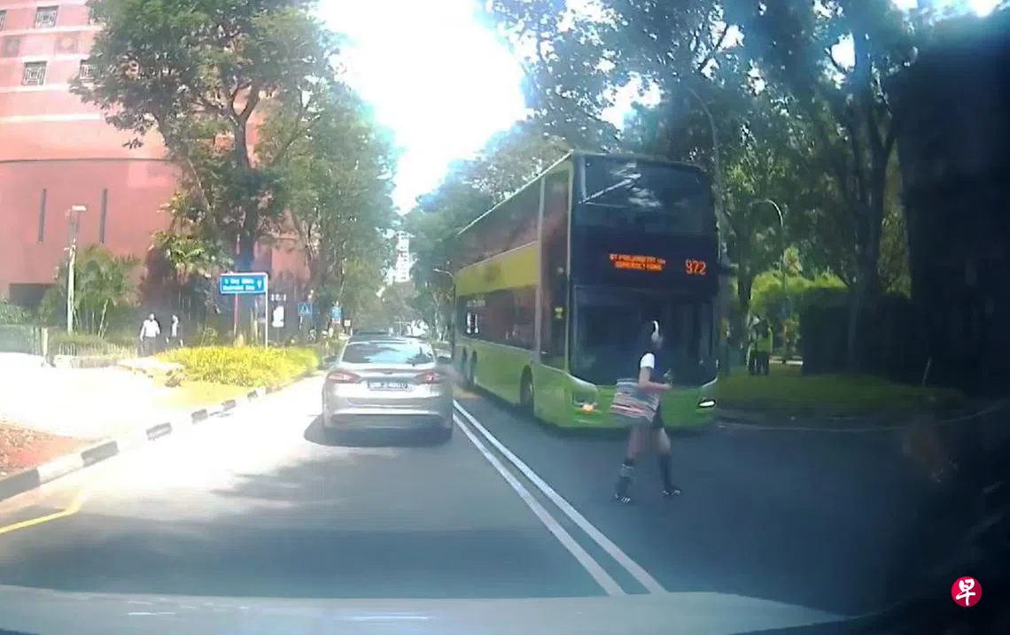 她没有向左边查看就跨步要走到另一条车道,此时一辆巴士从左边朝她驶来。巴士车长和录下这段视频的司机急忙鸣笛,但女郎看似仍未警觉,再踏出两步后才意识到巴士驶近,急忙后退闪避。巴士车长则紧急刹车,避免了事故的发生。