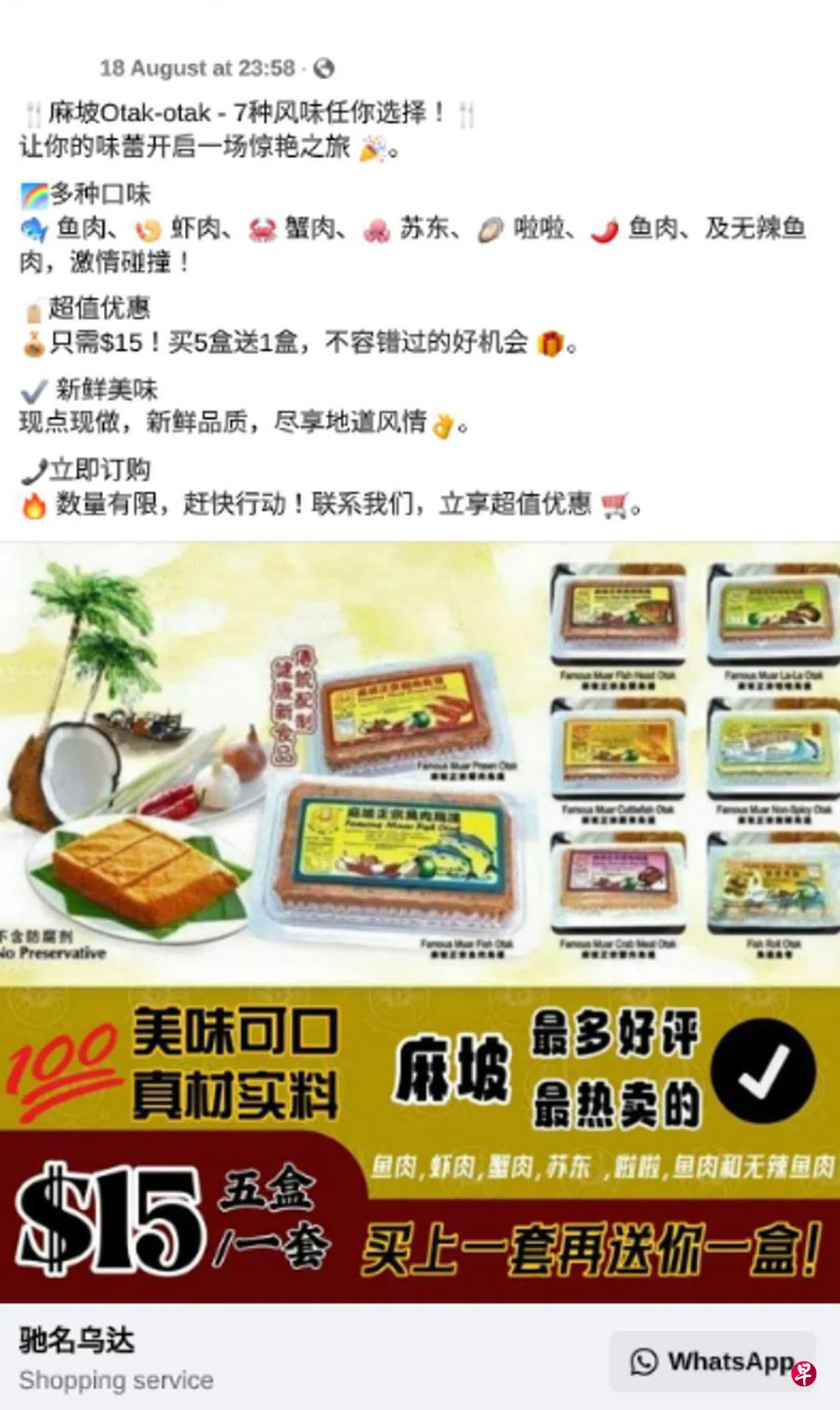 新加坡警察部队星期二(9月17日)发布文告说,警方近来注意到骗子经常使用一款新的恶意软件诈骗手法,骗子会在脸书上发布广告,以推销乌打等食物为名,吸引受害者点击链接。