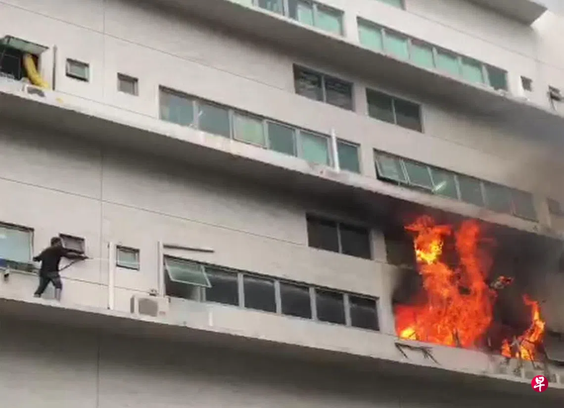 网上流传出视频,一名男子从窗户爬出,站在五楼的窗沿拿着水管试图灭火。