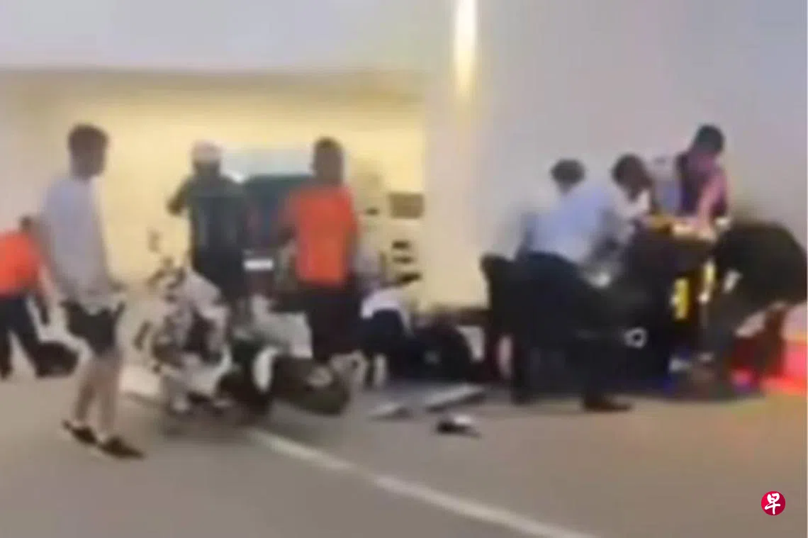 这起事故发生在星期天(9月22日)傍晚。社交媒体流传的一个视频显示,一群人正试图扶起道路左侧的第一辆电单车,背景可以听到有人疑似在呐喊求助。人群的后方也可以看到有人在对倒地的电单车骑士给予帮助。据了解,车祸的起因是一辆辅警电单车和另一名公众的电单车相撞。
