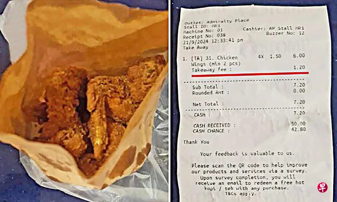 日前有公众在STOMP发文,指自己上星期六(9月21日)中午到海军部坊(Admiralty Place)邻里购物中心的Cantine食阁,在一个西餐摊打包了四只炸鸡翅膀,结果被收取1元2角的打包费。