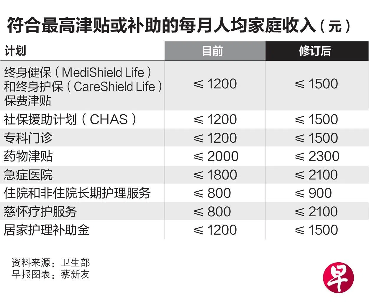 从星期二(10月1日)起,卫生部将调高超过10种医疗援助计划和津贴的人均家庭收入顶限,多达110万名新加坡人可享有更高的津贴。
