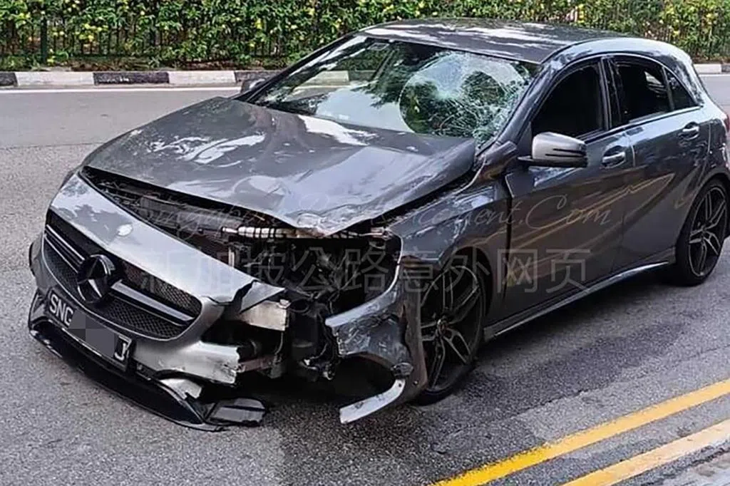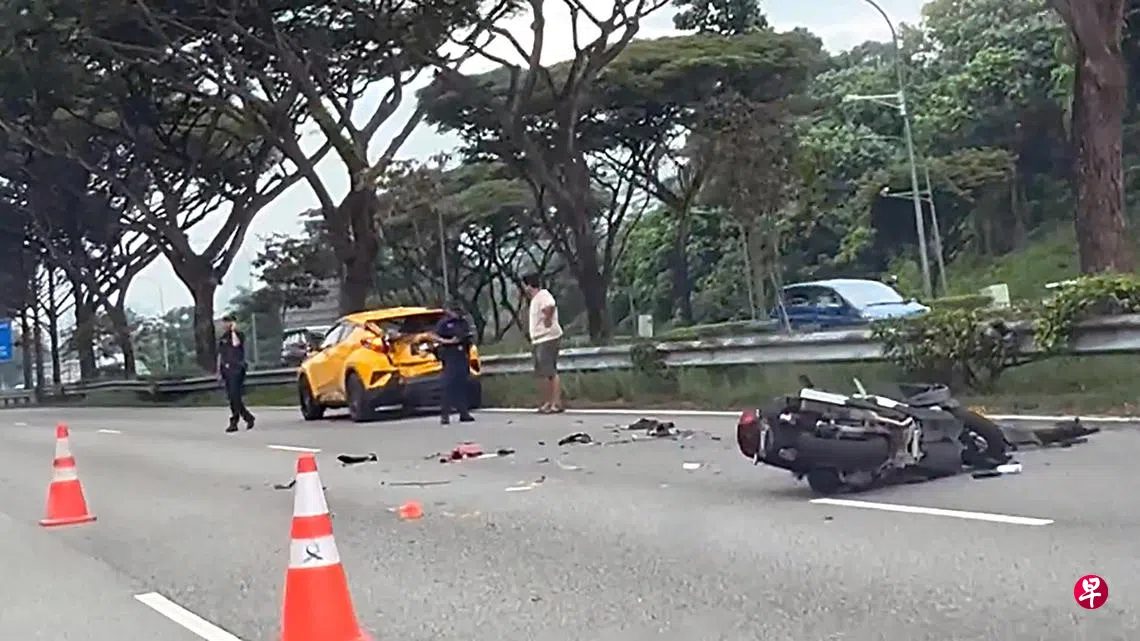 《联合早报》摄影记者经过车祸现场拍摄的画面显示,一辆电单车翻倒在地,留下满地碎片,前方还有一辆黄色汽车,后备箱明显凹陷。事故现场已经有至少两辆警车和一辆拖车,第一和第二条车道被封锁,执法人员放置路锥警示其他车辆,同时进行调查工作。