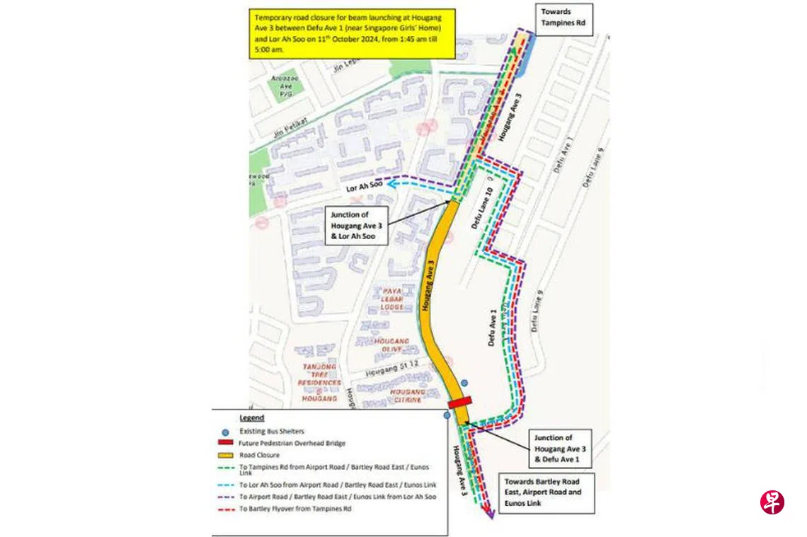 为建造新行人天桥,后港3道的部分路段下星期五(10月11日)凌晨禁止车辆通行。