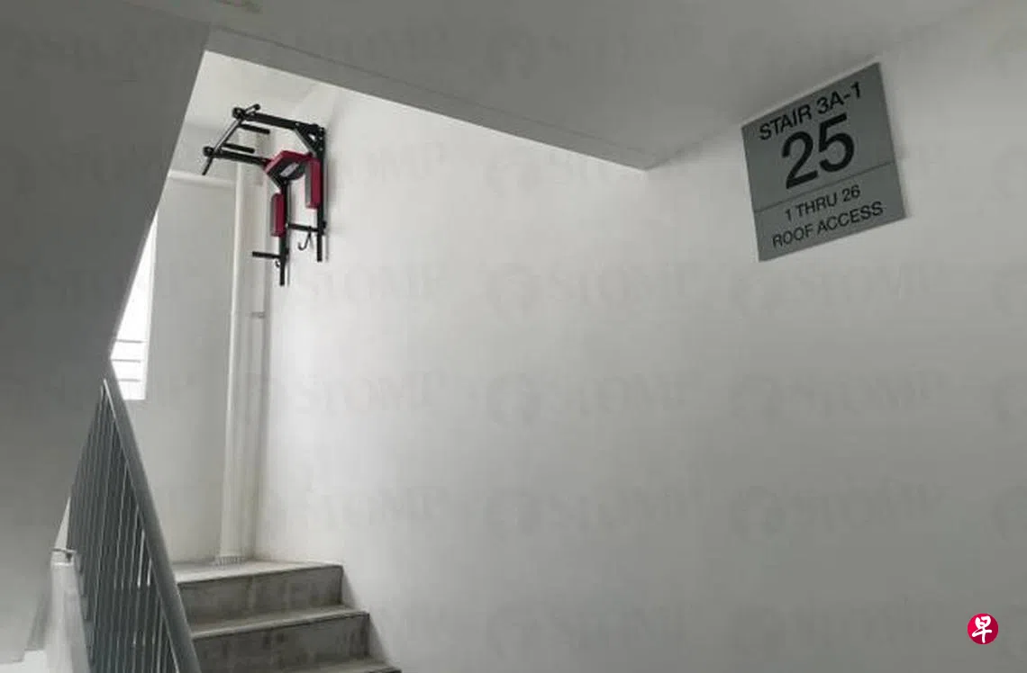 有网民申诉,榜鹅一带北岸弯第423A座组屋25楼的楼梯间内,有居民在墙上安装了健身器材。他称,健身器材已安装超过六个月,市镇会获悉后,上个月在墙上贴了通告,要求移除物品。对此,网民随后也联系上了STOMP。