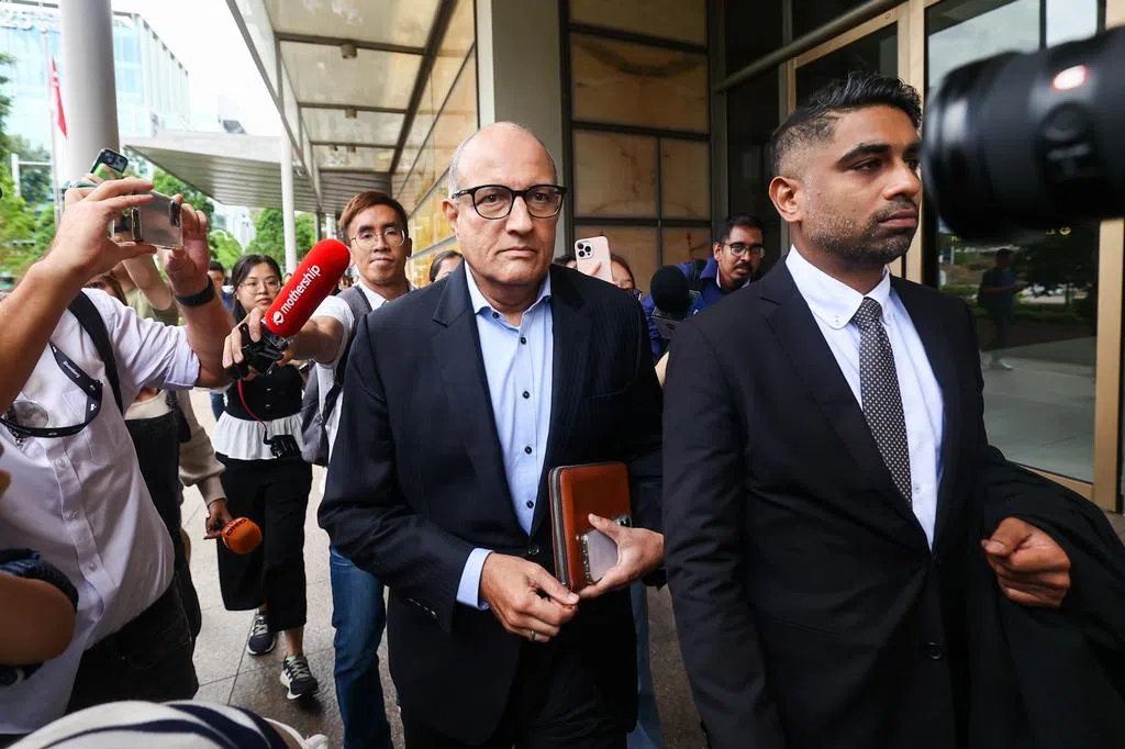 他身穿深蓝色短袖衬衫和黑色长裤,与他之前出席法庭聆讯时西装笔挺的装束有所不同。