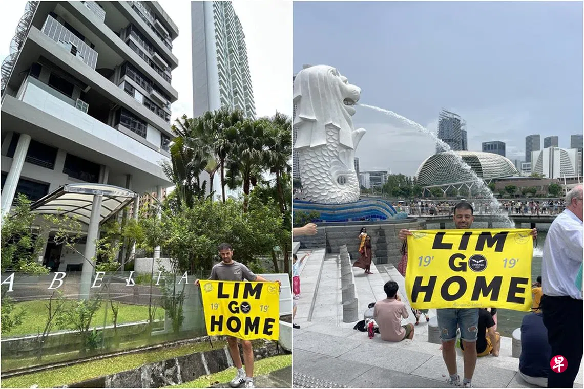 综合外媒报道,这对夫妻是西班牙甲级足球联赛球队巴伦西亚(Valencia)的球迷。丈夫达尼·奎斯塔(Dani Cuesta)上星期四(10月3日)在社媒平台X上数次发文,内容包括他到鱼尾狮公园举旗帜抗议,以及到林荣福名下一处产业外举旗帜,以及在门口贴上贴纸。旗帜和贴纸上都写着“Lim Go Home”(意指要林荣福“走”)的字眼。