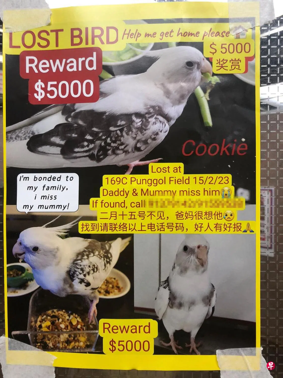 洪雪雯说,把曲奇带回家时它还是只雏鸟,她与丈夫看着曲奇长大,也投入了很多心血。因此,曲奇飞走的第二天她就在组屋附近张贴启事,并悬赏1000元感谢金给找到曲奇的人。