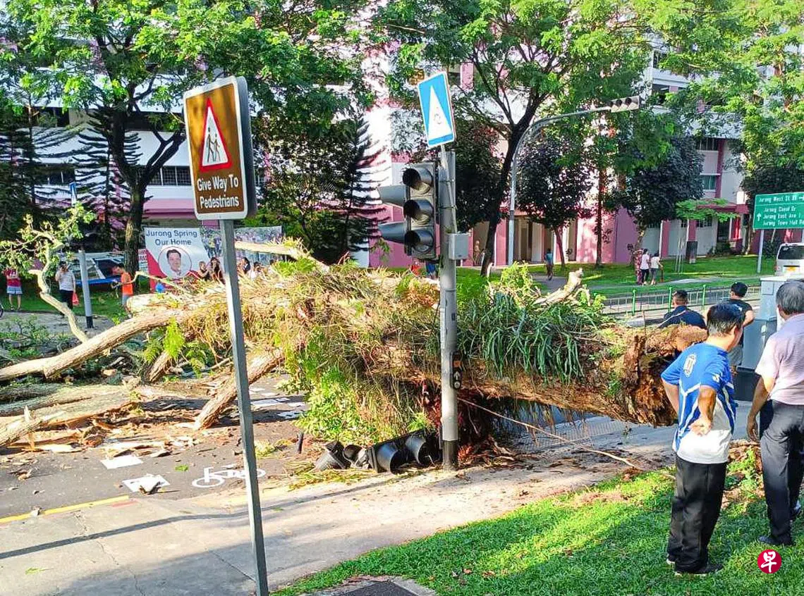 据读者提供的照片,这棵大树位于裕廊西42街第454座组屋附近的一个交通灯路口。倒下的大树横跨两条马路,路口处的红绿灯也被压倒,一名路人被压伤。