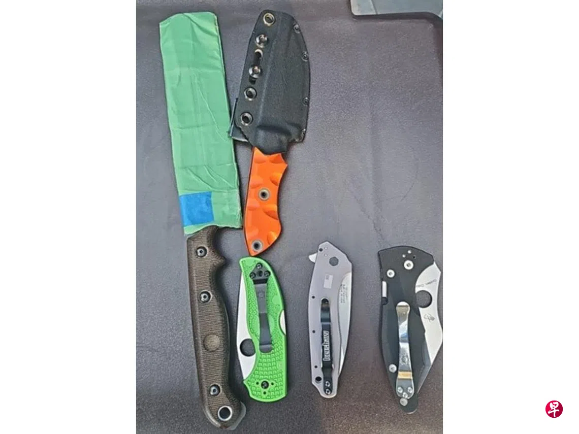 根据警方提供的照片,被告身上携带一把菜刀、一把短刀和三把折叠刀。