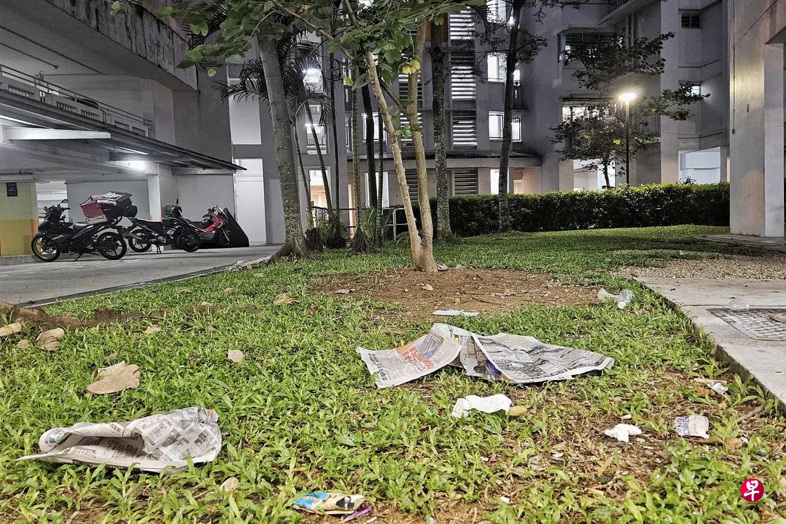 记者走访该座组屋时,发现组屋楼下周围的草地上除了有一包包的垃圾外,也有报纸、塑料瓶、纸巾等。据观察,电梯里张贴着国家环境局的海报,提醒居民不要高楼抛物,并指高楼抛物是严重的违法行为。为了有效执法,当局或在没有事先通知的情况下,在高楼抛物持续发生的区域安装电眼。