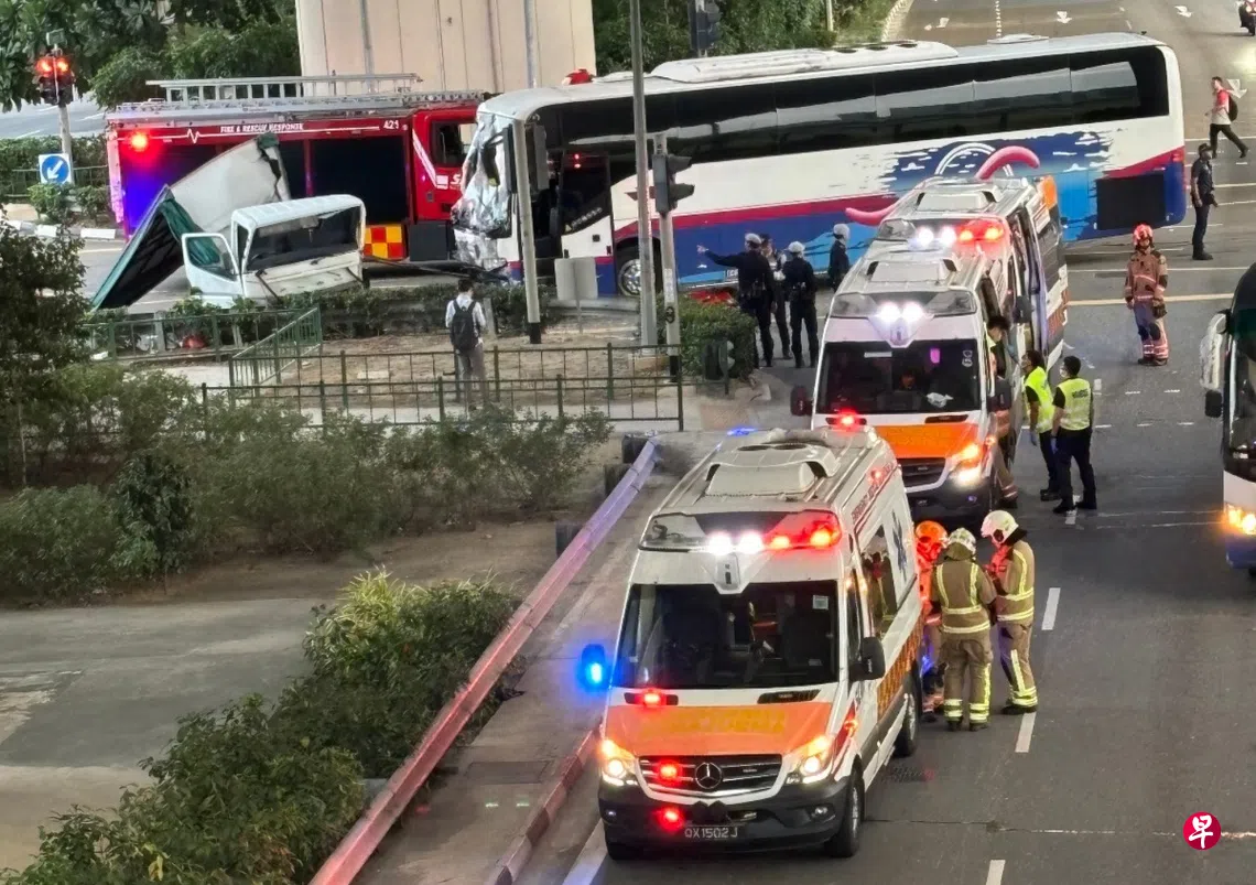 新加坡民防部队受询时说,救护人员在车祸后将六人送往黄廷方综合医院,一人被送往新加坡国立大学医院。