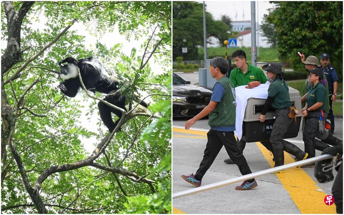 集团的动物护理和兽医团队星期四到达蔡厝港附近的丰涛别墅公园(Villa Verde Park)追捕这只东黑白疣猴(eastern black-and-white colobus monkey)。