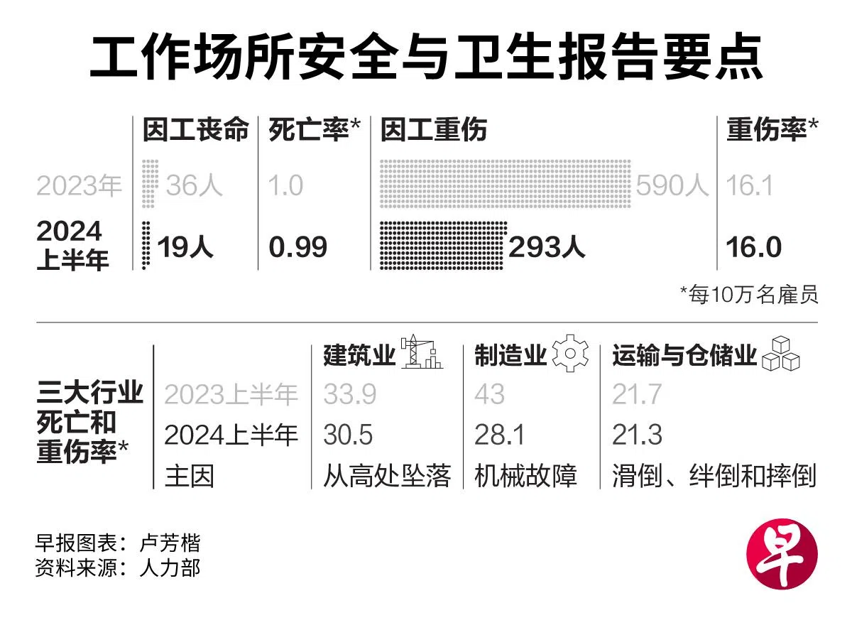 人力部公布的工作场所安全与卫生报告显示,今年上半年,有19人因工伤事故丧命,同比增加五人;其中,有11人因车辆事故或高处坠落而不幸身亡。