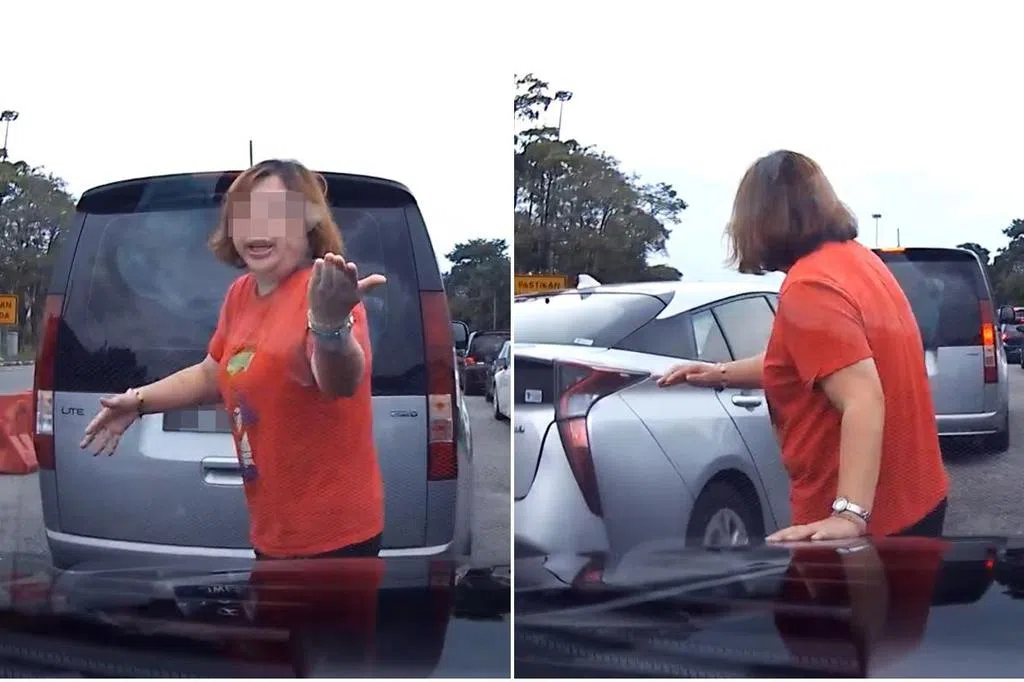 《新明日报》星期六(11月2日)报道,日前一段时长六秒的视频在网络上流传,一名妇女被行车记录仪拍下她站在一辆汽车前,不顾其他车主不断鸣笛,挥手让两辆新加坡注册车子通过。