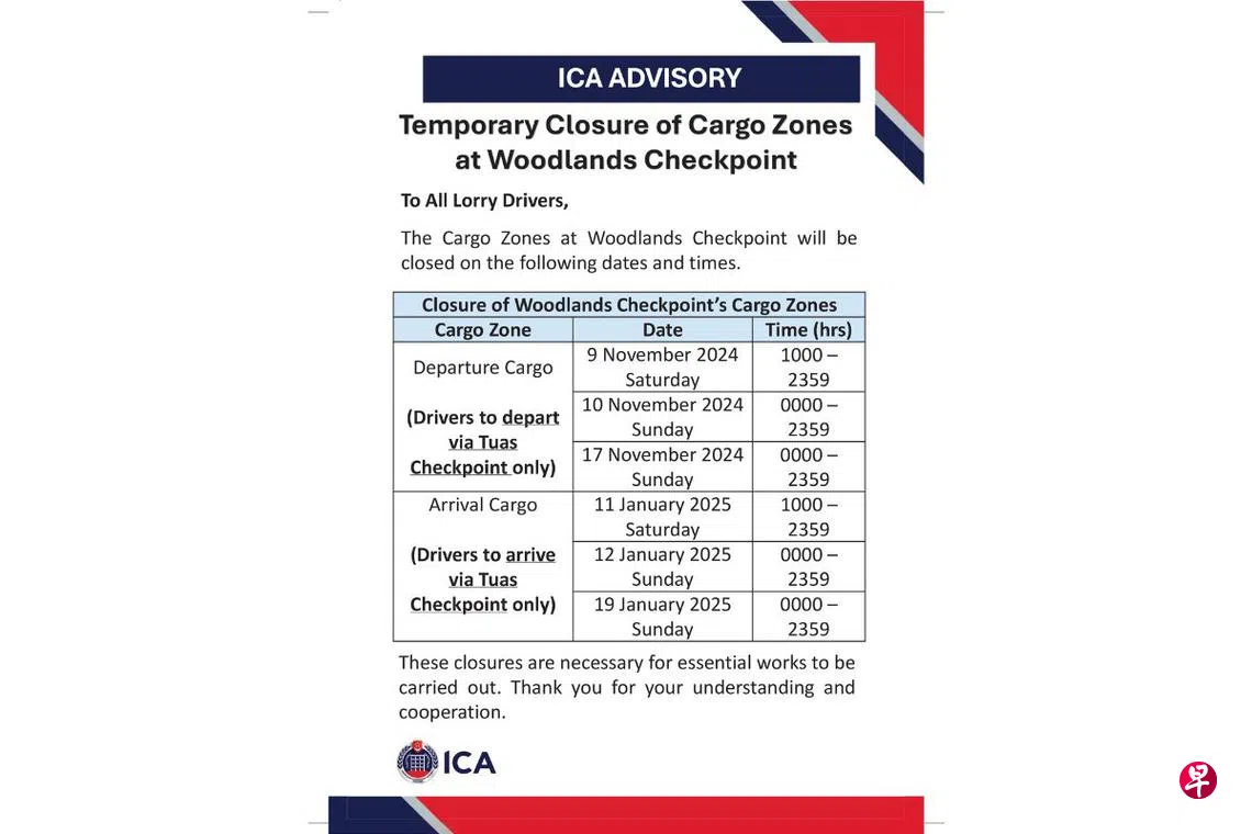 移民与关卡局发言人答复《联合早报》询问时证实,兀兰关卡货物通关处将关闭进行维修与翻新,但关卡的其余区域不受影响,将继续正常运作。
