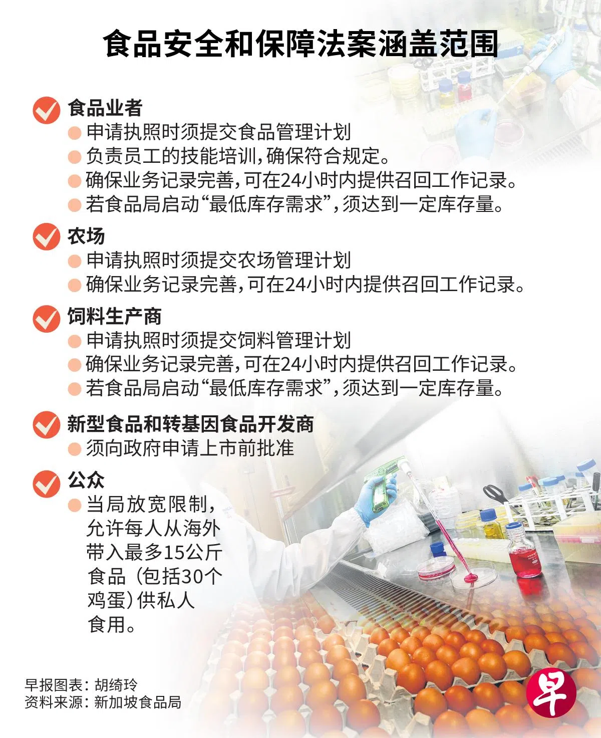 目前,每人只能从海外带入最多5公斤肉类和海鲜、少量水果和蔬菜,以及30个鸡蛋供私人食用。根据星期二(11月12日)在国会提出一读的食品安全和保障法案(Food Safety and Security Bill),每人日后可从海外带入最多15公斤食品(包括30个鸡蛋)供私人食用。