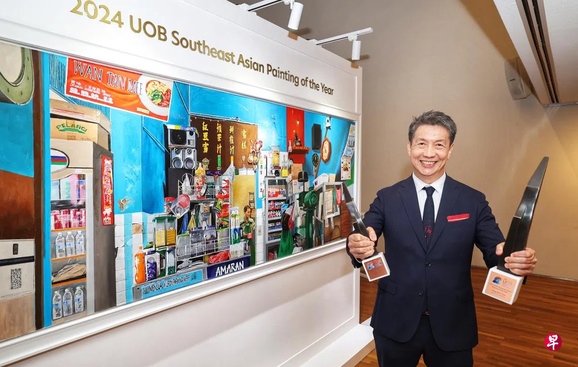 从事保险业,业余作画的杨伟伦(63岁)凭借写实描绘怀旧咖啡店的胶彩双连画《品味时光》,获颁2024年第43届大华银行绘画比赛全场总冠军——东南亚最佳画作大奖。他也是新加坡资深画家组最佳画作大奖得主,赢得4万6000新元总奖金。