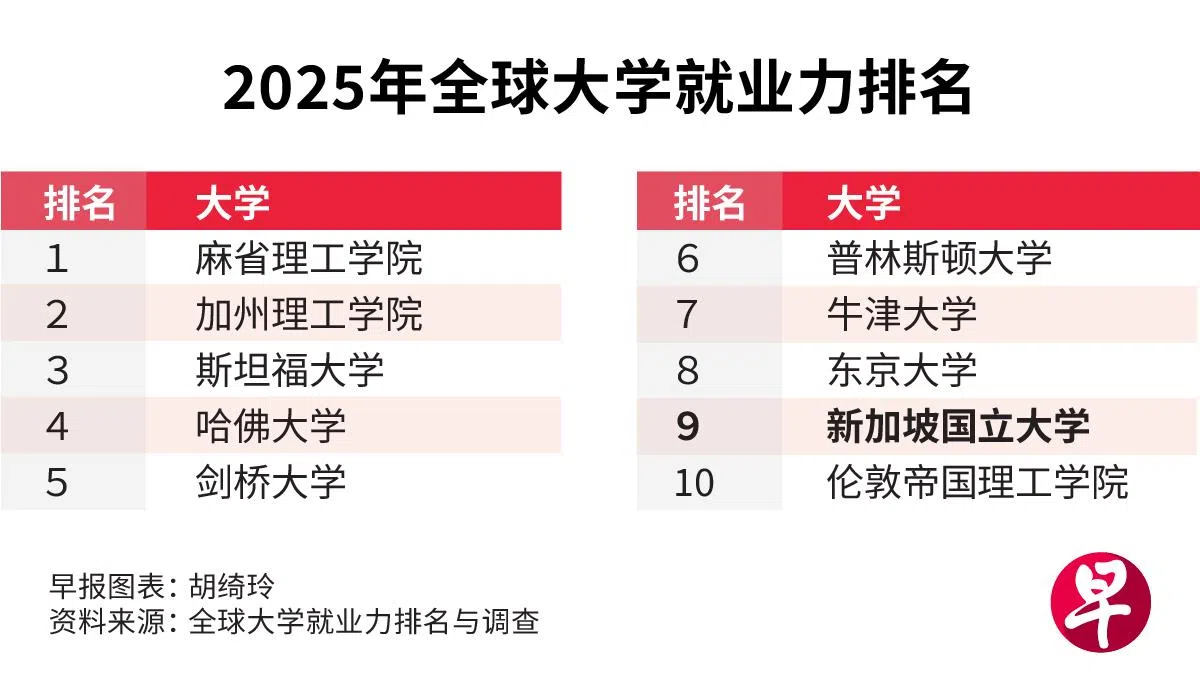 在最新的全球大学就业力排名中,新加坡国立大学保持全球第九位,南洋理工大学排名33。