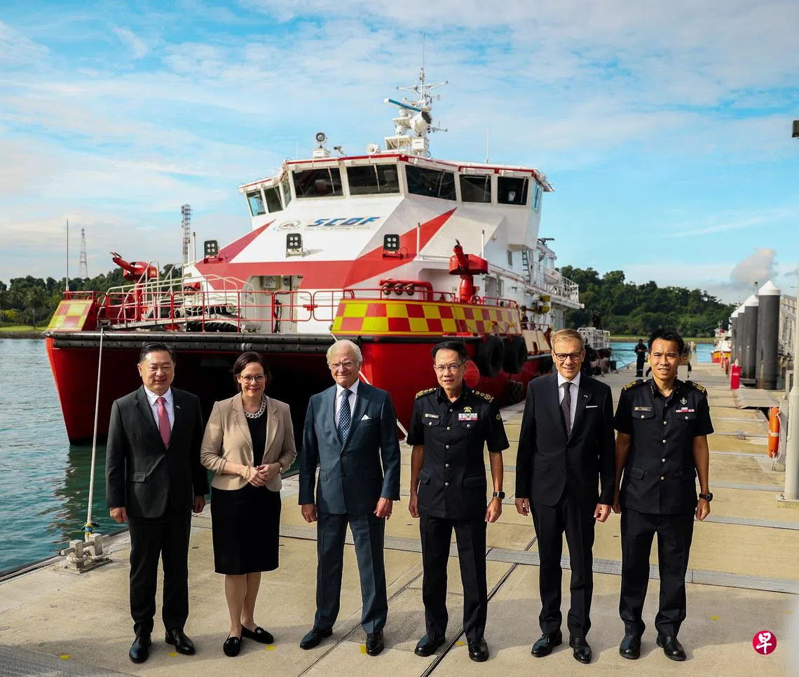 新加坡民防部队在脸书贴文说,卡尔十六世星期四在我国驻瑞典非常驻大使关国忠的陪同下,参访海事消防分区。民防部队总监叶伟德和海事消防分区司令王元为助理总监到场与他们会面。