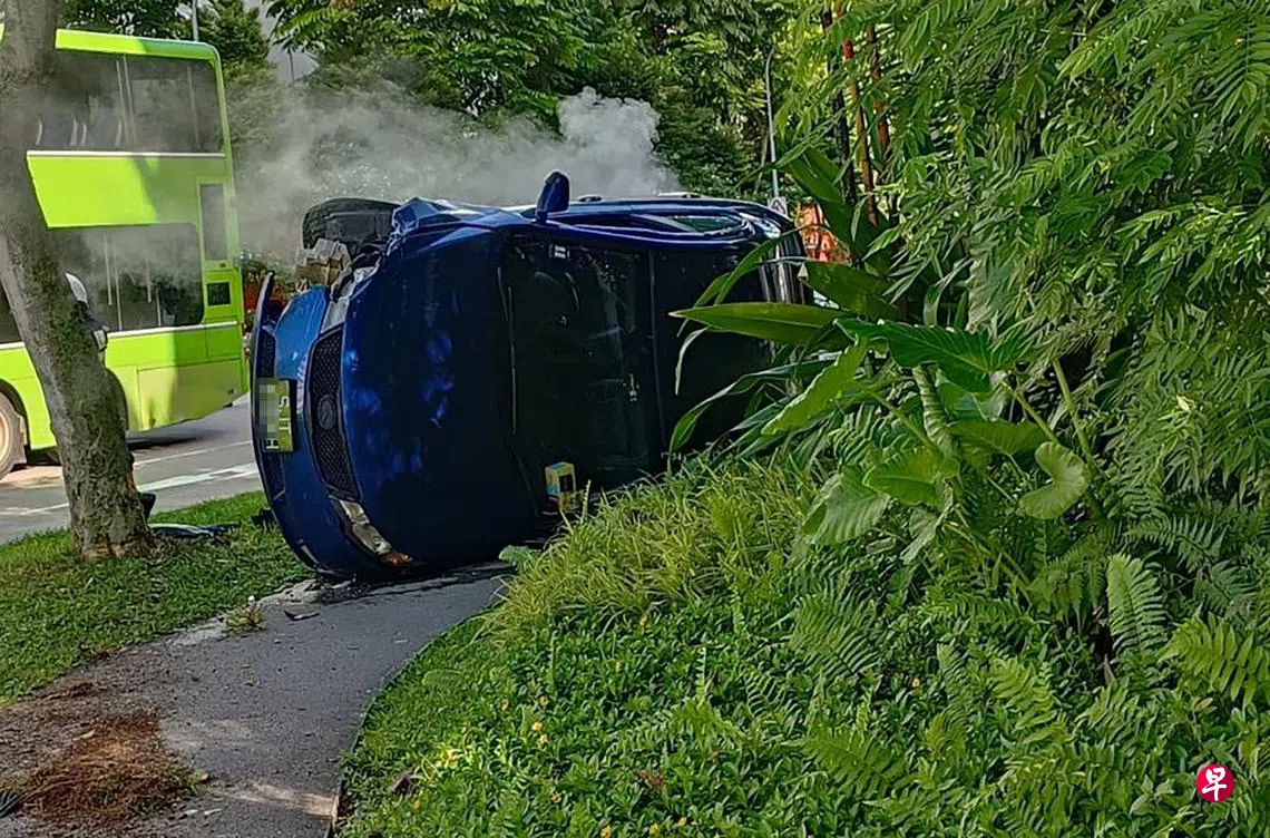 根据脸书专页“新加坡公路意外网页”所上载的照片,一辆蓝色汽车侧翻在路旁的走道上,当时有至少两辆交警电单车到场,现场也拉起了封锁线。