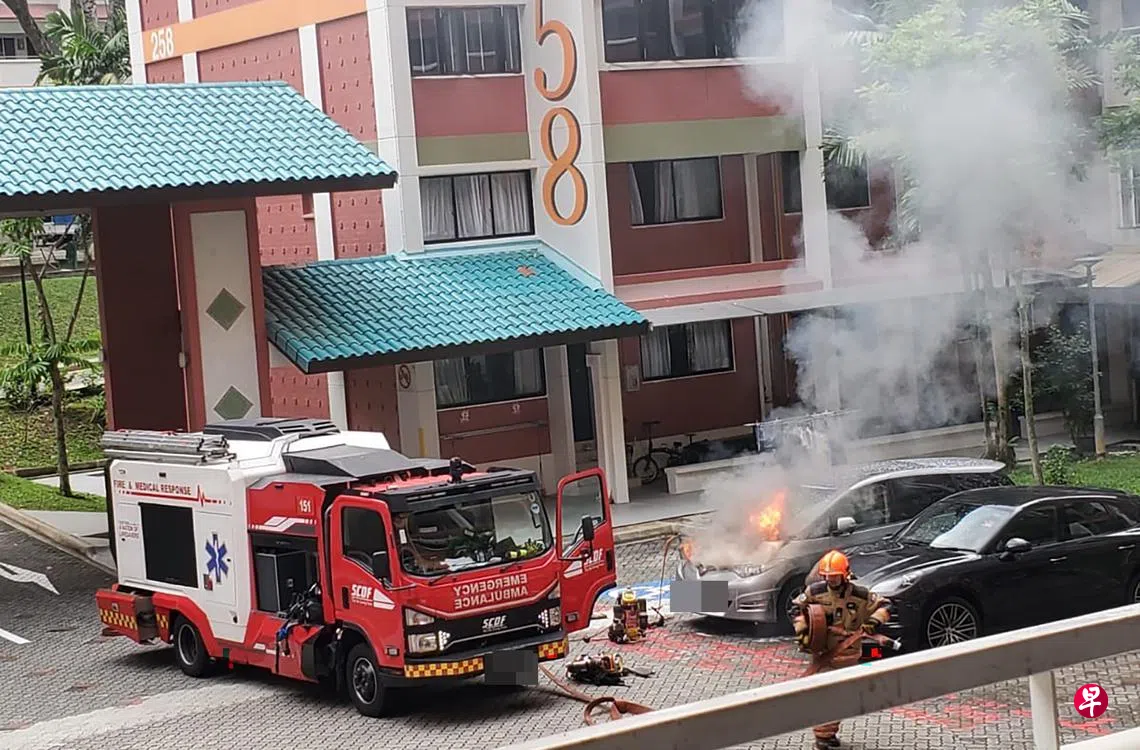 一辆汽车在碧山组屋露天停车场起火,民防部队及时赶到灭火。